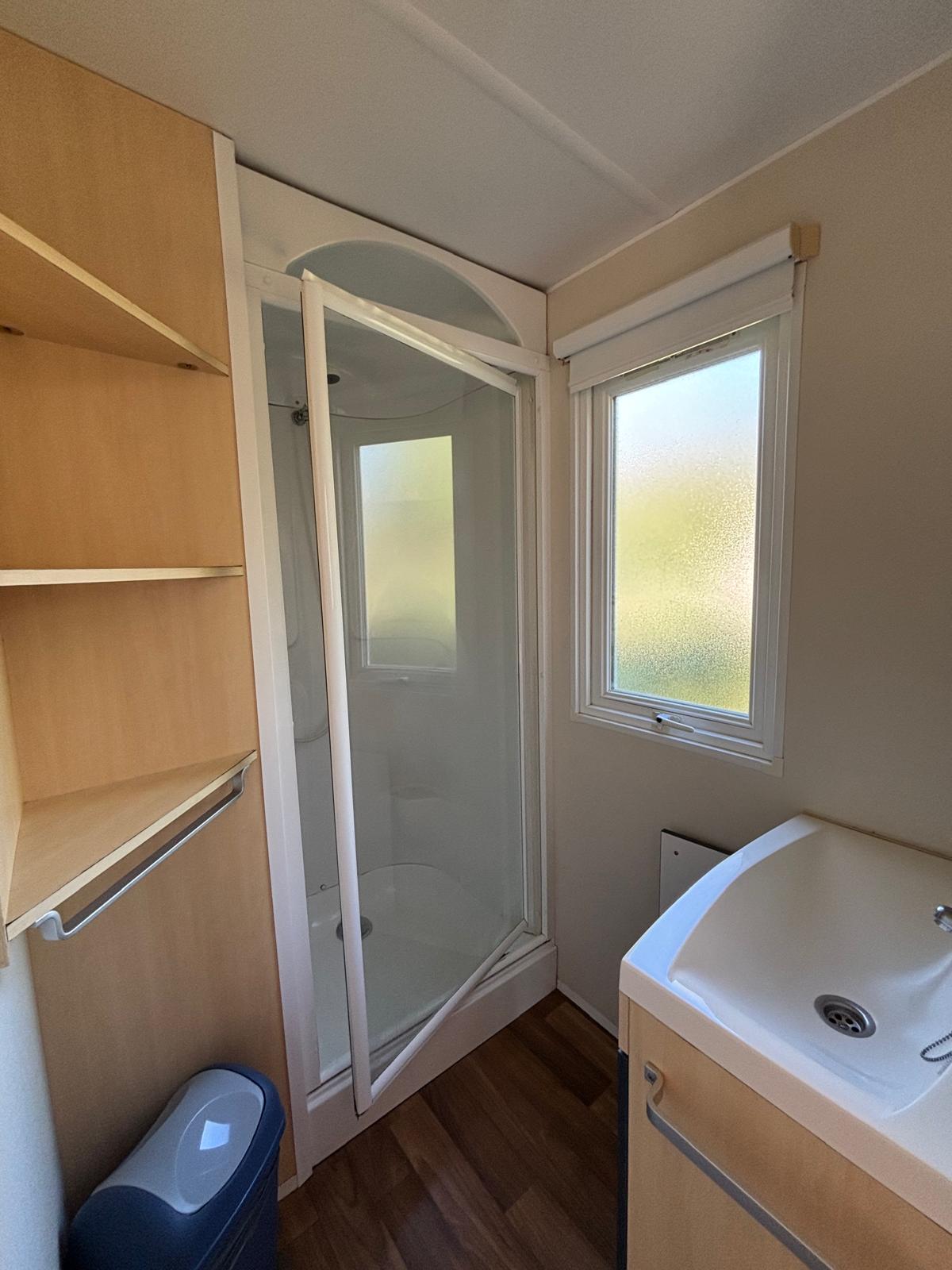 - une salle de bain avec douche et d’un WC, ainsi qu’un coin salon avec une télévision