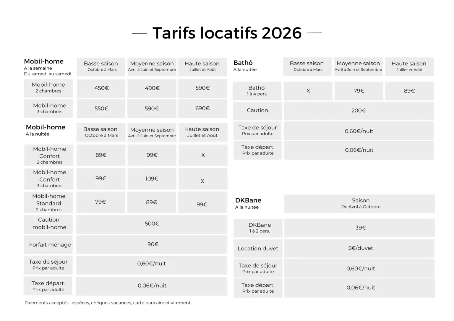 • Location du mobil-home • Emplacement pour un véhicule • Arrivée à partir de 17h / départ avant 10h